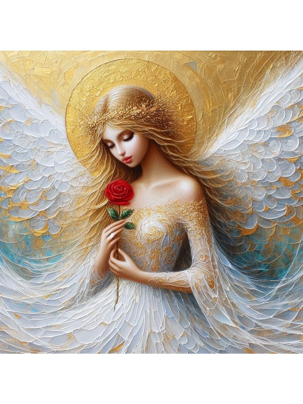 Nádherný anděl, který něžně voní k rudé růží, je andělem pravé a věčné lásky. Přináší partnerské požehnání.